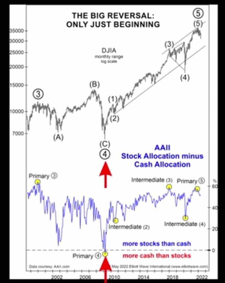 At this point my belief in wisdom of crowds gets shaken. Wisdom of crowd is only valid if the crowd acts on it and not just says what they feel. Recently, I came across a very interesting chart from Elliott Wave institute (below) which captures market moves and investors market positioning. The chart is shown below just to depict negative sentiment is not followed by market positioning and doesn’t intend to give doomsday forecast.
